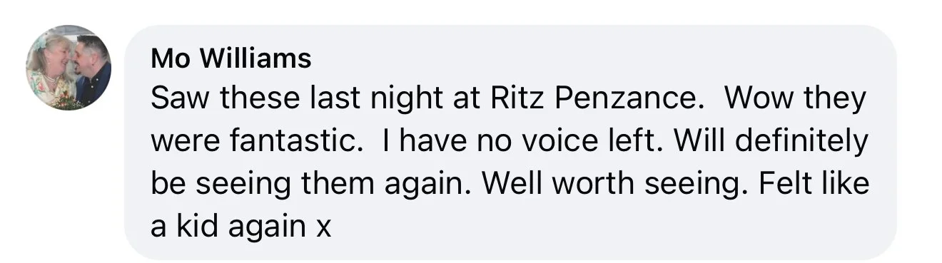 Another great gig produced lovely reactions from the crowd. The audience were starting to rock from the first number and then dancing broke out in the aisles and ‘down the front’, as usual!